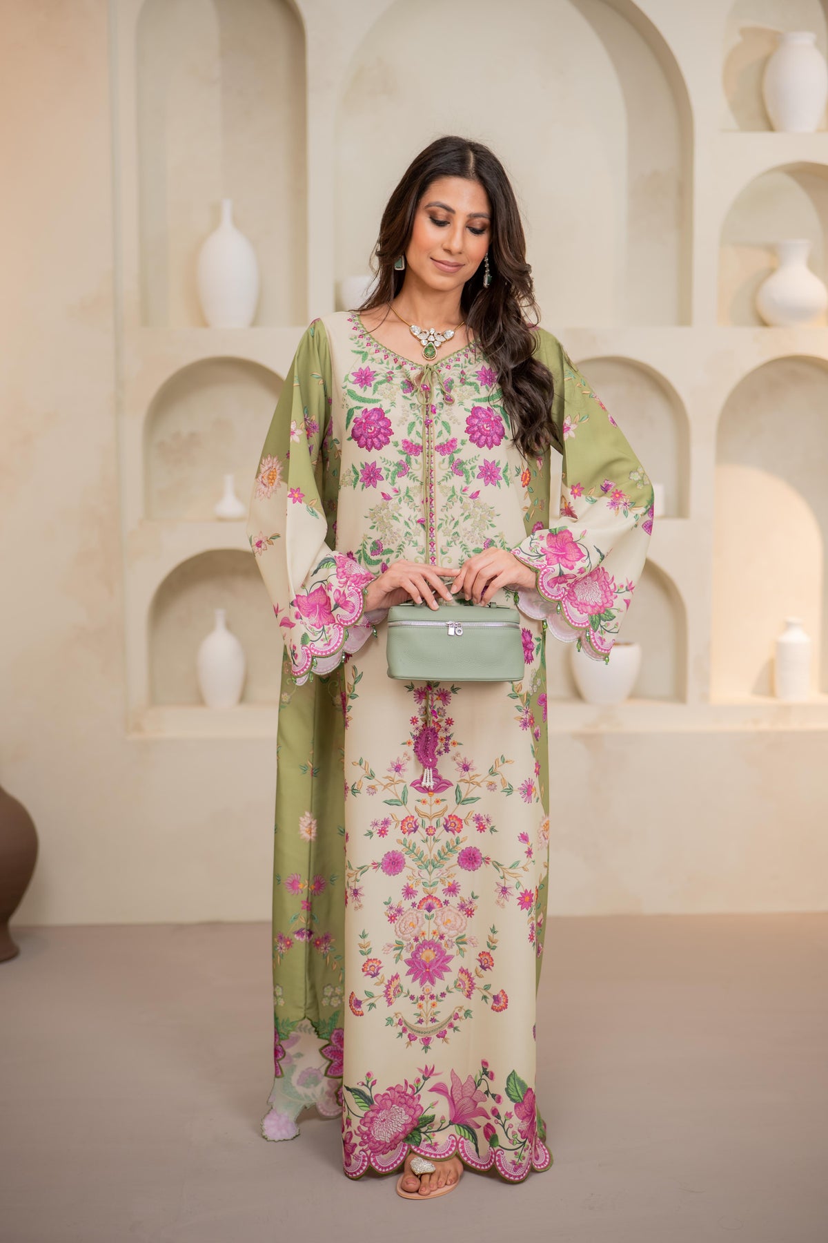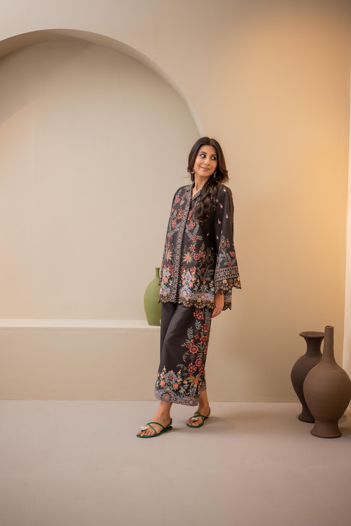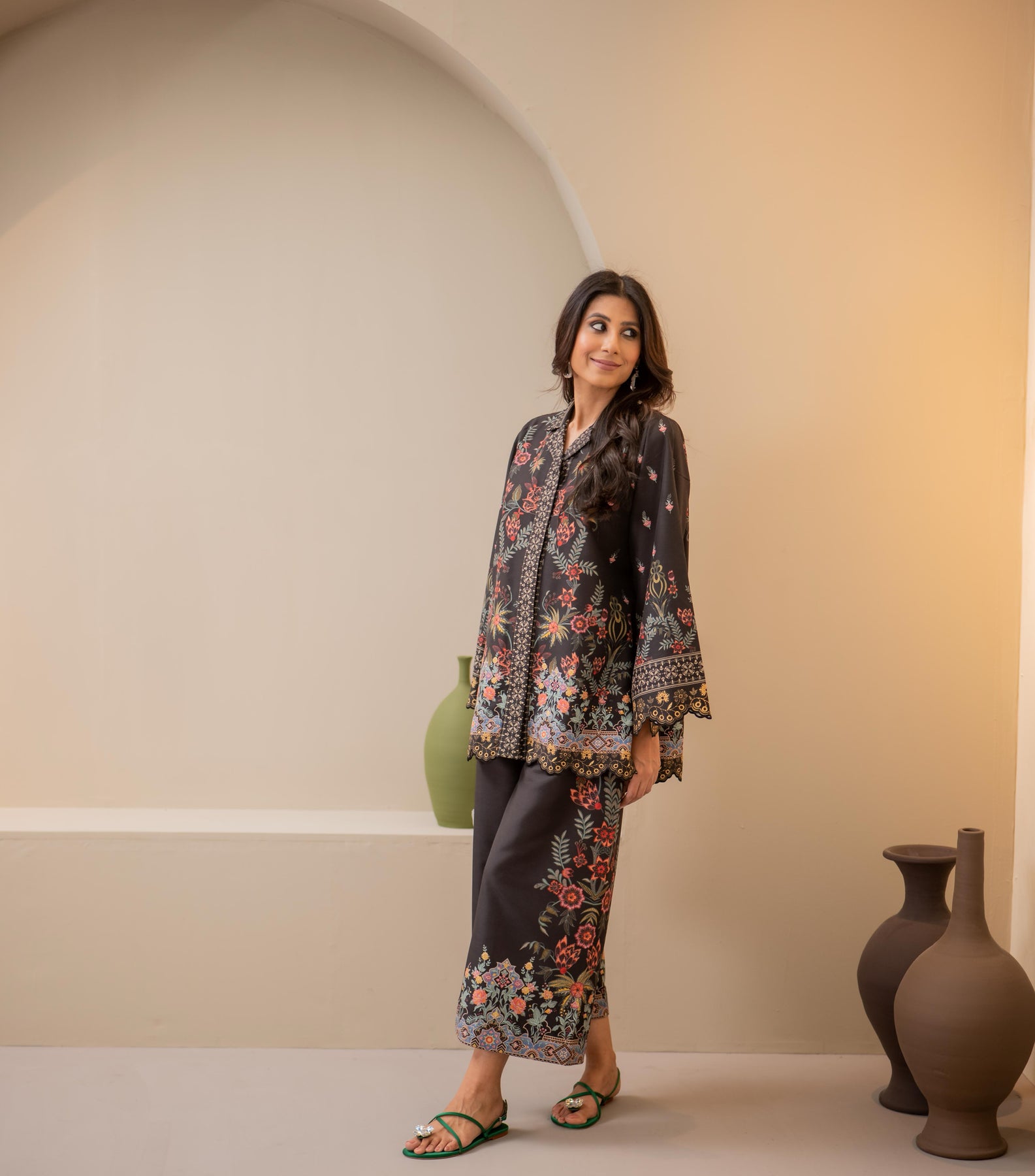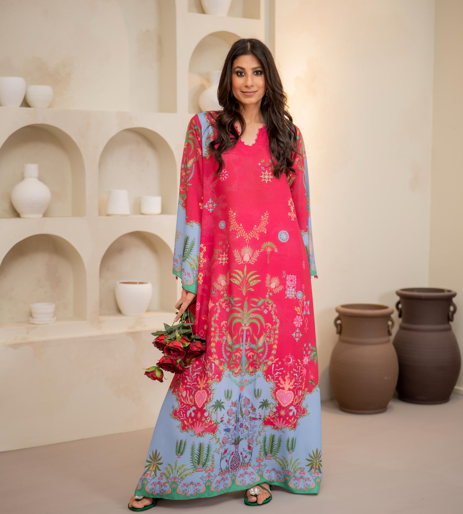 A statement of elegance and artistry, this teal long shirt is adorned with intricate 3D flowers, embroidered birds, and delicate leaves, creating a mesmerizing blend of texture and detail. Crafted from Pure Raw silk, the flowy silhouette offers a flattering fit, perfect for festive occasions and refined gatherings.