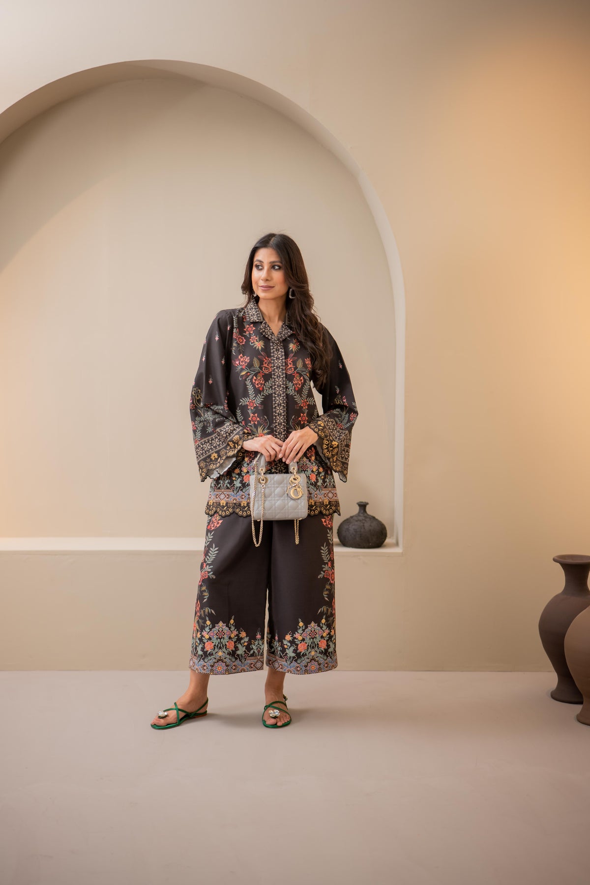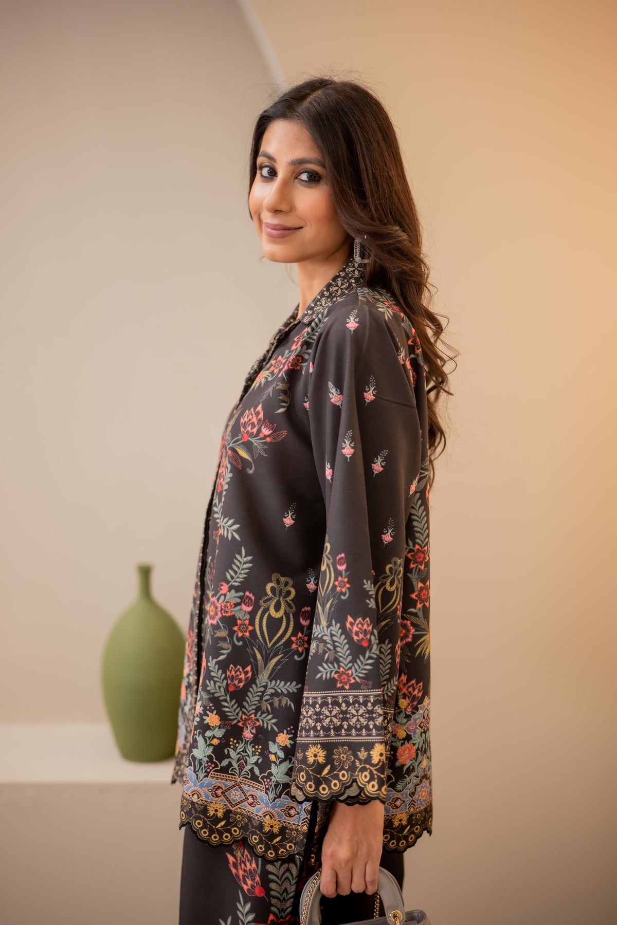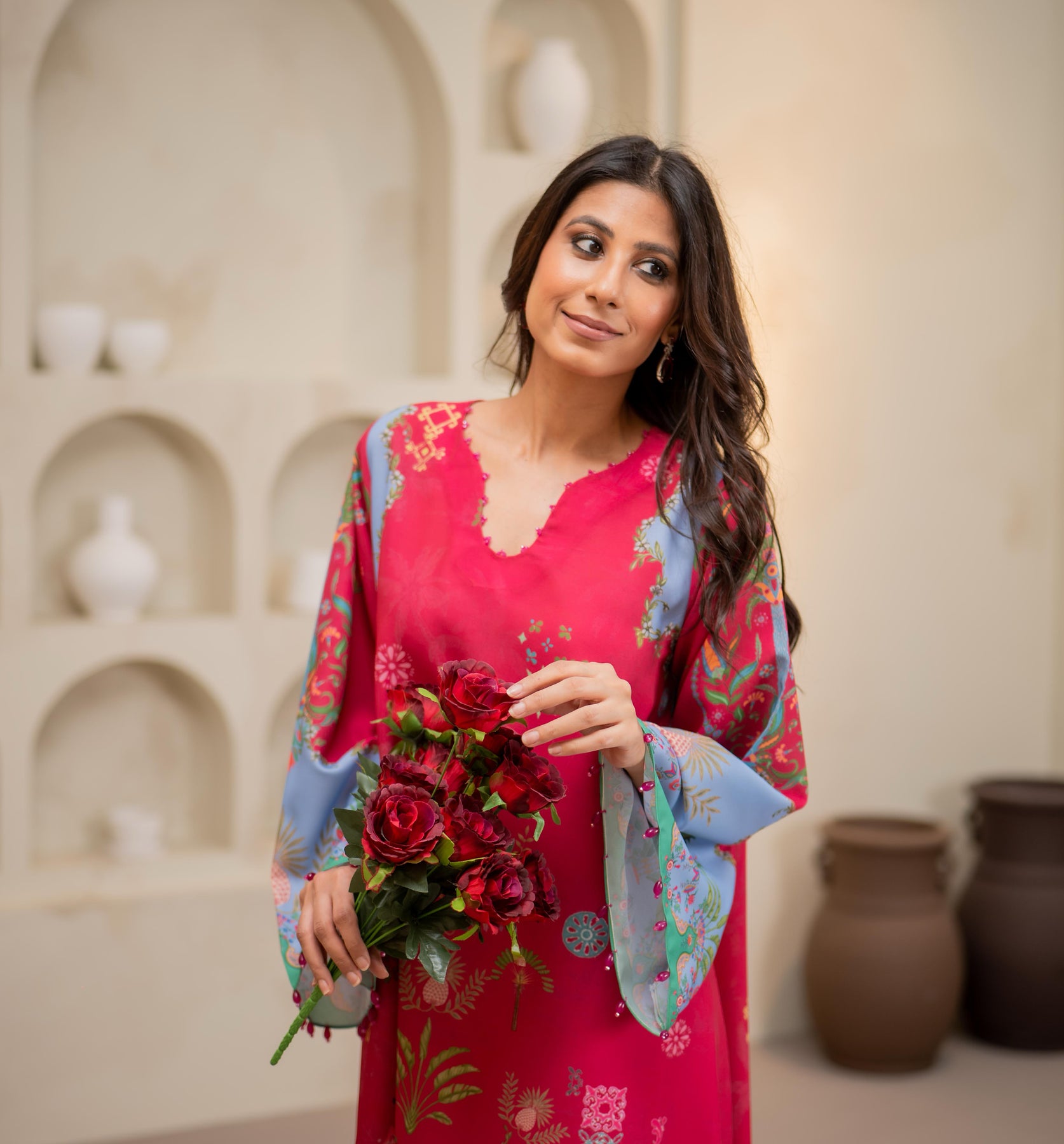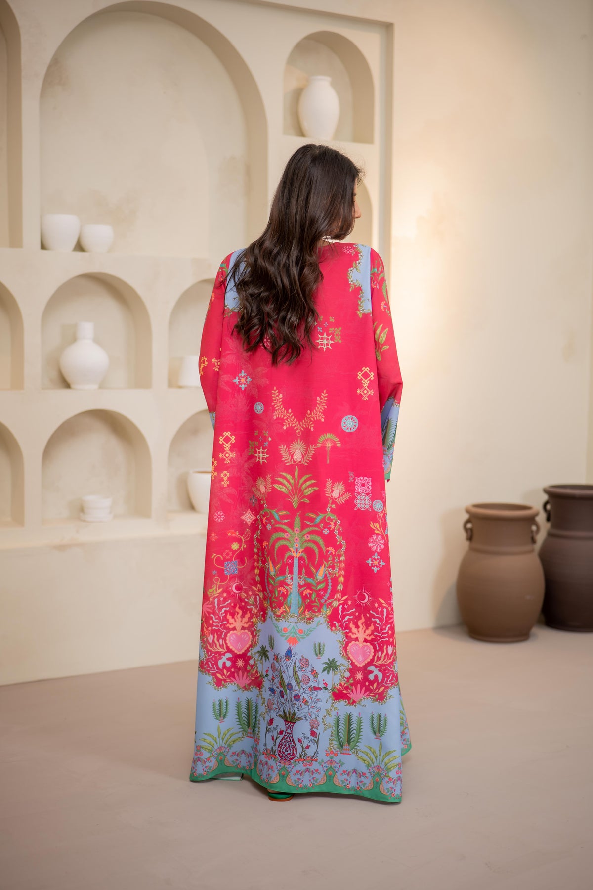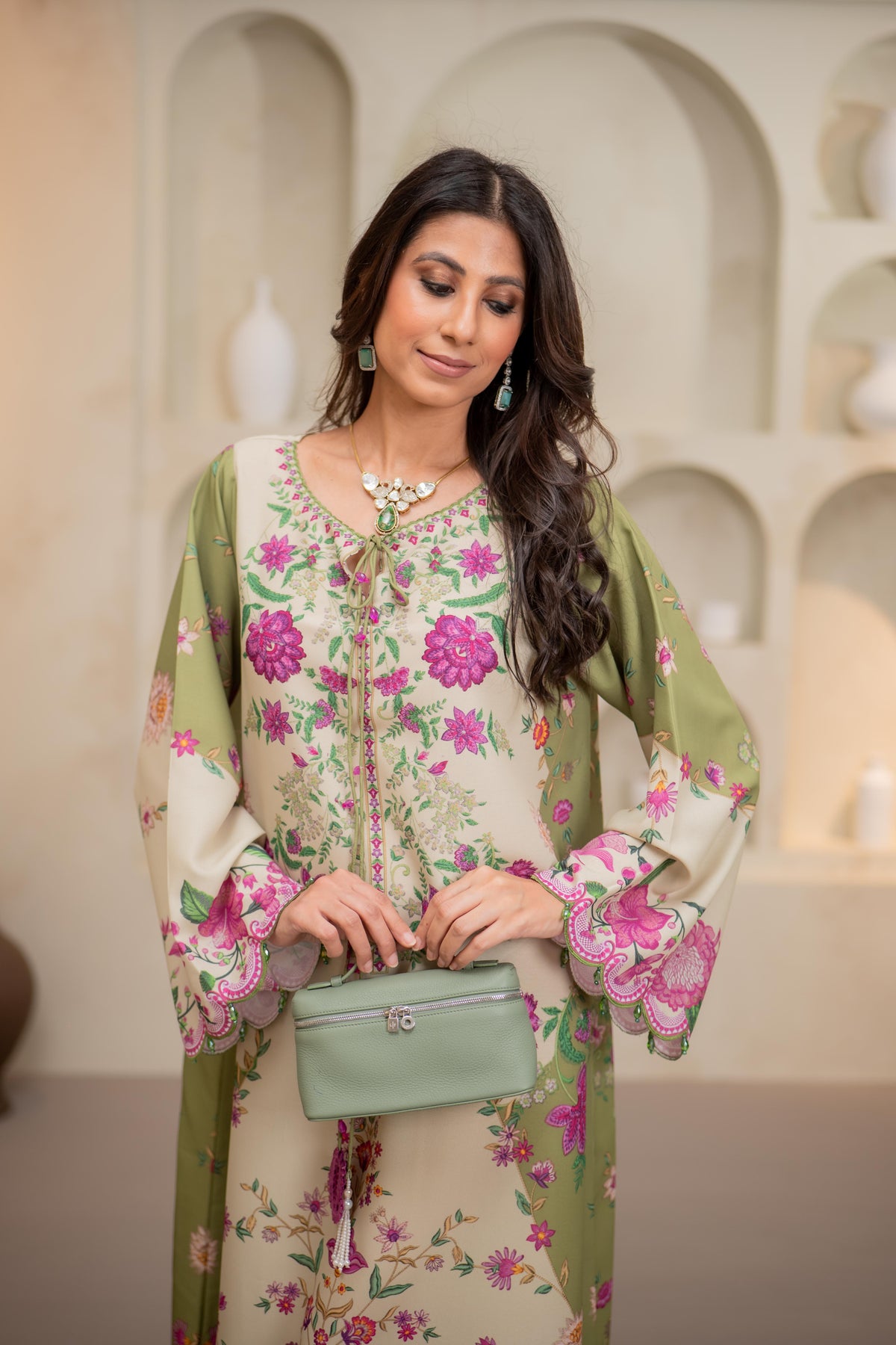 A statement of elegance and artistry, this teal long shirt is adorned with intricate 3D flowers, embroidered birds, and delicate leaves, creating a mesmerizing blend of texture and detail. Crafted from Pure Raw silk, the flowy silhouette offers a flattering fit, perfect for festive occasions and refined gatherings.